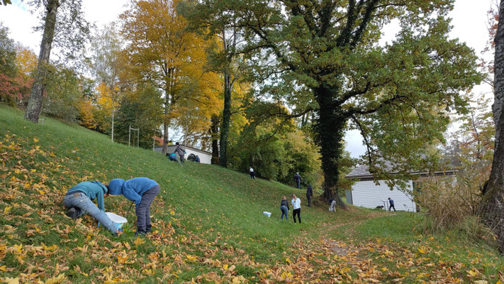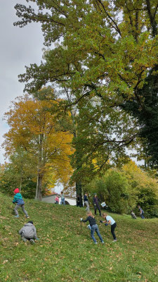 Damit es im kommenden Frühjahr schön blüht rund ums Gloriettl, machten sich die Kinder nach einer kurzen Einführung von Georg Schmötzer an die Arbeit und pflanzten 1000 Frühblüherzwiebeln in die Erde. Dort liegen diese nun und warten bis die ersten warmen Sonnenstrahlen sie zu neuem Leben erwecken werden. Mit ein wenig Glück werden Blaustern und Traubenhyazinthe dann die sonnigen Südhänge rund um den Weiher in ein zartes Frühlingsblau tauchen. Bienen und andere Insekten können diese erste Pollen- und Nektarnahrung gut gebrauchen um gesund und vital ins Insektenjahr zu starten. Wenn alles gut geht, die Zwiebeln sich wohl fühlen an ihrem neuen Standort, dann werden sie sich auch vermehren und noch in vielen Jahren an die Arbeit der Umwelt-AG erinnern. Zum Abschluss der gemeinsamen Arbeit gab es feine Blaubeermuffins und Apfelsaft aus eigener Produktion sowie eine private Führung durch den Eiskeller mit allerlei interessanten Einblicken in das Leben und Schaffen von Emanuel-von-Seidl, Architekt und Namensgeber unserer Schule. Diese fruchtbare und herzliche Zusammenarbeit von Schule und Förderkreis ist für beide Seiten ein großer Gewinn. Wir freuen uns schon auf ein Wiedersehen im Frühling, hoffentlich mitten in einem Blumenmeer!