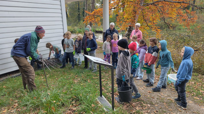 Beim Anpacken und Mithelfen lernten die Seidlschülerinnen und -schüler viel über Linde, Spitzahorn, Walnuss und Wildkirsche und bestaunten gleichzeitig ehrfürchtig die Spuren, die überall vom Biber zu finden sind. Nach getaner Arbeit entführte Dieter Wieland die Kinder bei Apfeltee und Krapfen auf eine Zeitreise ins noch junge 20. Jahrhundert zu Emanuel-von-Seidl und sein Gelobtes Land.