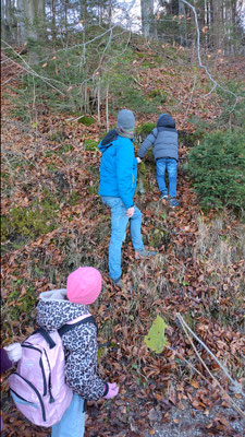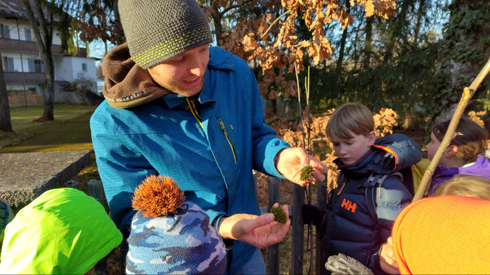 Die Ethikgruppe der 3. Klassen und die Buben-Umwelt-AG haben sich gemeinsam auf Formensuche begeben und interessante Gebilde im Schulgarten gefunden.