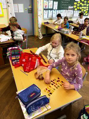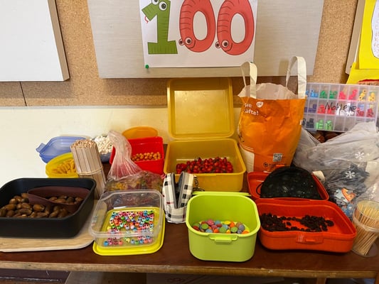 Zu diesem Anlass brachten alle Kinder 100 Gegenstände ihrer Wahl mit. Jeder durfte „seine“ Dinge vorstellen und die anderen Kinder staunten über den Einfallsreichtum der Klassenkameraden. Es kamen Gummibärchen, Backerbsen, Maiskörner, Hagebutten, Nudeln, Rosinen, Zahnstocher, Wattestäbchen, Holzstäbchen, Perlen, Teelichter, Glasmurmeln, Puzzleteile, Eicheln und sehr viele Kastanien. Nach der Vorstellrunde wurde eine kleine 100er Ausstellung eröffnet. Dabei blieb es aber nicht: Jeden Tag übten die Schülerinnen und Schüler mit ihren Materialien den Zahlenraum strukturiert darzustellen und zu erfassen. Dabei hatten alle Spaß und lernten ganz nebenbei etwas Neues!