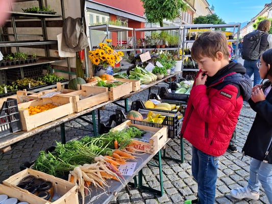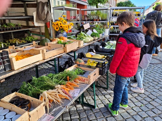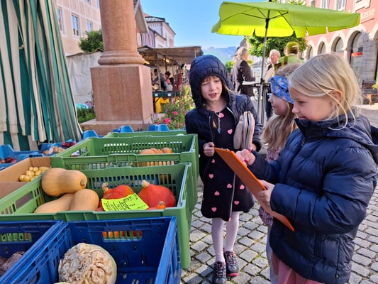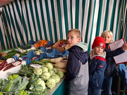 Am 18.09.2024 fand eine Exkursion der Klasse 2b zum Wochenmarkt statt, der nur wenige Minuten zu Fuß entfernt liegt. Die Kinder teilten sich vorab in Dreiergruppen auf und erledigten eigenständig verschiedene Aufgaben rund um das Thema "Gemüse" Auf dem Markt konnten sie zahlreiche Gemüsearten entdecken, darunter Kartoffeln, Blumenkohl und Zucchini. Zudem erhielten sie die Information, dass die Ware aus Ohlstadt und dem Allgäu stammt. Die Ergebnisse der Gruppenarbeit wurden im Anschluss gemeinsam besprochen.