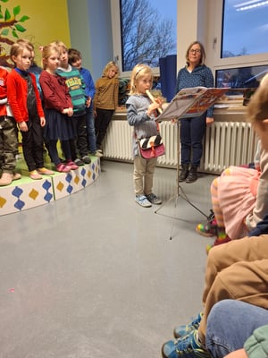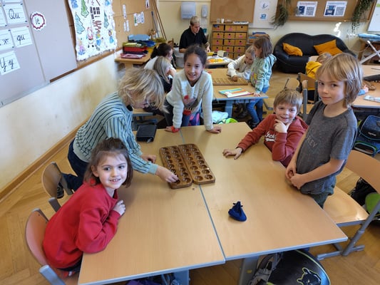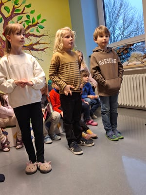 Jeden Tag öffnete ein anderes Kind das Türchen und was sich dahinter verbarg, begeisterte stets alle. Zaubertricks, Gedichte und Experimente wurden vorgeführt und mit Applaus belohnt. Andere Kinder stellten Spiele, Lieder und Bastelarbeiten vor, die dann von allen gelernt und gemeinsam gespielt, gesungen oder nachgestaltet wurden. Einige Kinder hatten in Gruppen eine Kamishibai-Vorführung vorbereitet. Gespannt lauschten die Freunde und Freundinnen den Geschichten.