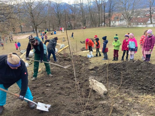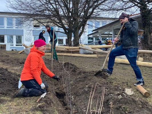Am 3. Tag waren so viele Helfer am Start, dass bereits bis mittags die Arbeiten am Spielplatz abgeschlossen waren und zeitgleich noch eine Hecke mit Beerensträuchern und 3 Apfelbäumen gepflanzt werden konnte.