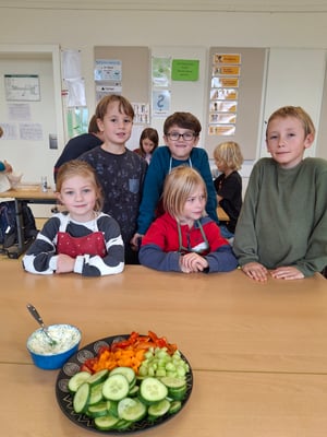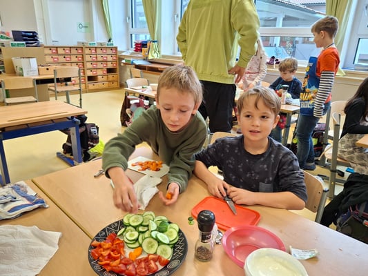 Am Freitag verwandelte sich das Klassenzimmer der Klasse 2b in eine Großküche. Da wurde eifrig gewaschen, geschält , geputzt und geschnitten und es entstand eine leckere Rohkkostplatte. Dazu wurde ein mit Kräutern verfeinerter Joghurt-Dipp zubereitet! Allen hat es sehr gut geschmeckt.