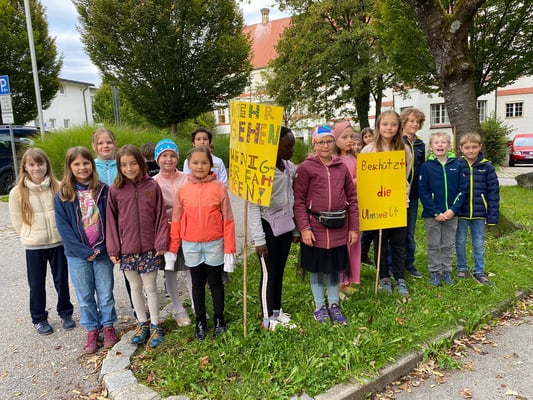 Die knallgelben Schilder der Klasse 4b machen seit Montag alle Elterntaxis außerdem darauf aufmerksam, dass diese Kurzstrecken im Auto dem Klima schaden. Zu Fuß gehen heißt nämlich auch, seinen eigenen kleinen, aber wertvollen Beitrag für den Klimaschutz zu leisten.