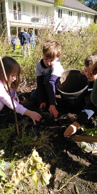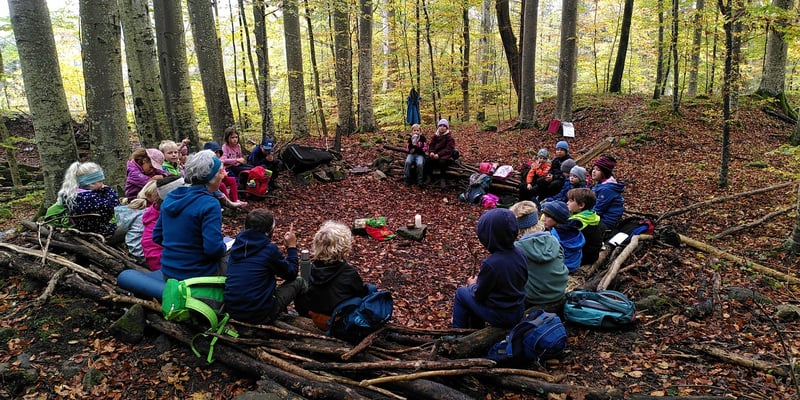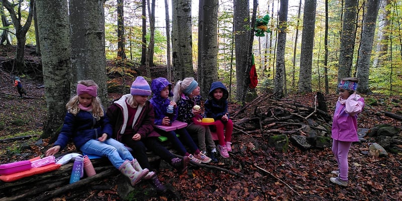 Im Wald angekommen, mussten erst einmal Renovierungsarbeiten am Klassennest durchgeführt werden, bevor wir es uns dort gemütlich machen und dem feinen Regenrauschen lauschen konnten. Unser Klassentier Mimo hatte schnell seinen Lieblingsplatz gefunden, von dem aus er alles gut beobachten konnte. Wir begrüßten den Wald mit unserem neuen Waldlied, suchten und fanden einige seiner Schätze und begannen in Gruppen Lager zu bauen. Auch einen "heiligen" Bereich mit einer riesigen Buche hatten die Kinder entdeckt, gleich neben einem Hexenkreis aus Pilzen.