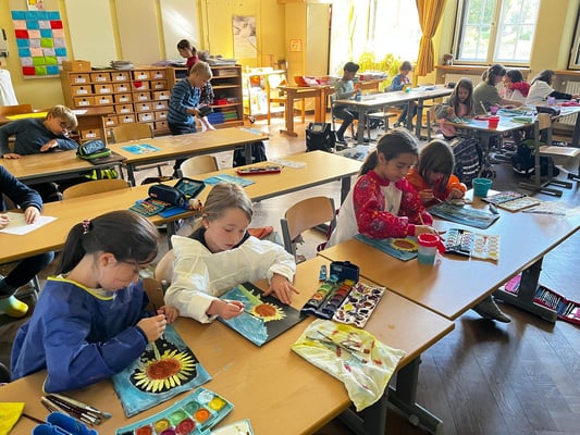 Weil in unserem Text auch eine Sonnenblume vorkommt, lag es praktisch auf der Hand, im Rahmen eines fächerübergreifenden Unterrichts, eben diese Blumenart zu malen. Wie man deutlich sehen kann,