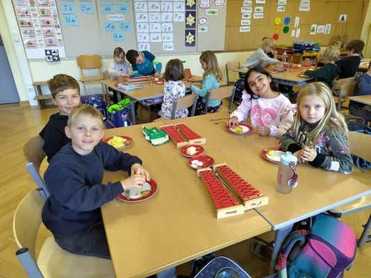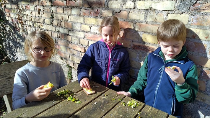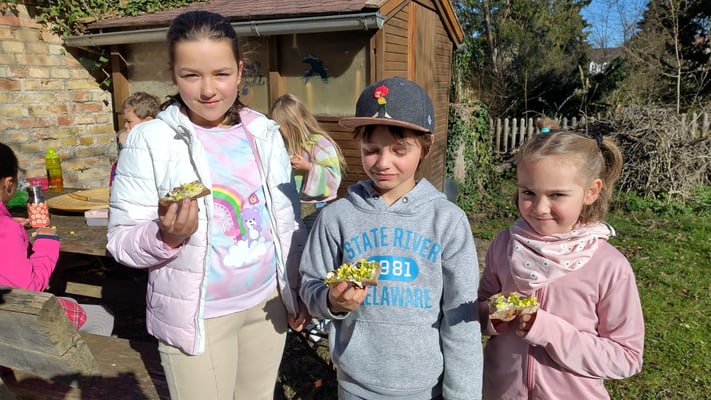 Frühblüher standen auf der HSU-Themenliste der Klasse 2c. Nachdem die Kinder ihre Artenkenntnis erweitert und Besonderheiten der einzelnen Pflanzen kennengelernt hatten, wussten sie auch, dass manche Blumen essbar sind. In unserem Schulgarten ist der Tisch mit Frühblühern schon reich gedeckt und so ließen sich die Schülerinnen und Schüler die selbst gemachten Blütenbutterbrote schmecken. Ein echter Genuss!