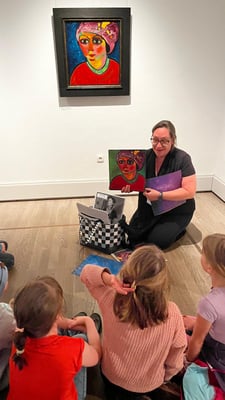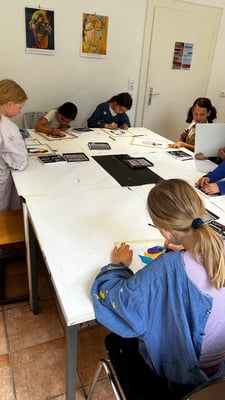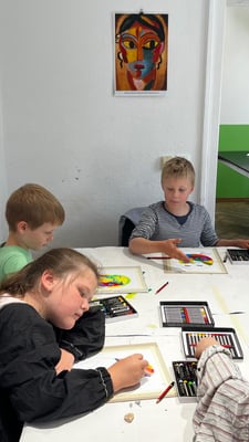Im Museum lernten die Kinder Bilder von Gabriele Münter, Wassily Kandinsky, Franz Marc und Alexei Jawlensky kennen und beschäftigten sich mit Farbenlehre und der Bedeutung der Farben für die Maler des „Blauen Reiters“.
