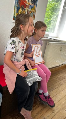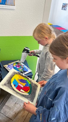 Im pädagogischen Programm ging es dann um die Porträts von Alexej Jawlensky und es konnten zunächst Gesichter mit magnetischen Streifen gelegt werden. Im Anschluss malten die Kinder Selbstporträts mit Ölkreiden und einen Hintergrund mit Wasserfarbe. Die Bilder wurden anschließend mit dem Fön getrocknet und bekamen dadurch ein sehr interessantes Aussehen.