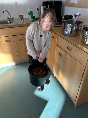 Gemeinsam mussten nun die Kartoffeln gewaschen und im Dämpfer angesetzt werden. Andere Kinder deckten die Gruppentische und schließlich konnte das gemeinsame Mahl beginnen.