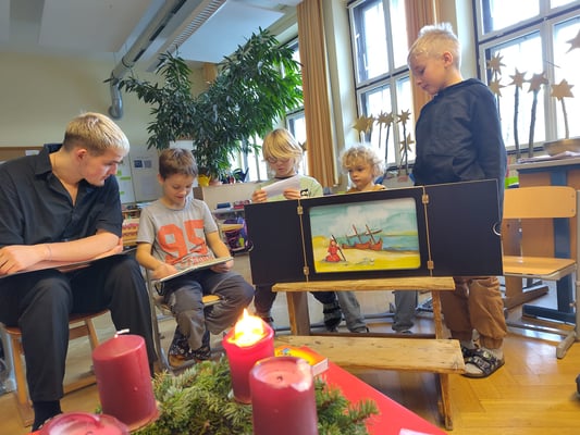 Die Kinder der Klasse 3a lesen den Kindern der Klasse 1c weihnachtliche Geschichten vor.
