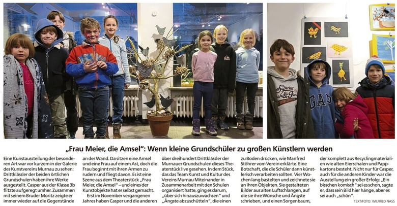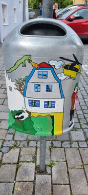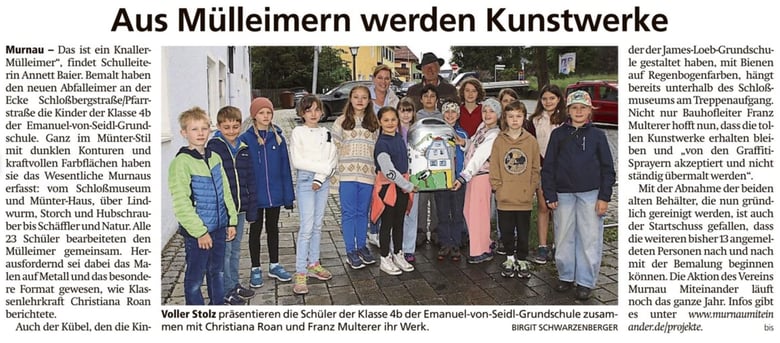 Einem besonderen Projekt widmeten sich die Kinder der Klasse 4b der Emanuel- von- Seidl- Grundschule, zu dem der Verein Murnau Miteinander aufgerufen hatte. Aus einem schlichten silbernen Eimer wurde ein richtiges Kunstwerk. Typische Wahrzeichen Murnaus, wie ein Schäffler, das Schloss, der Storch, das Münterhaus, die Mariensäule und sogar der Rettungshubschrauber sind in kraftvollen Farben und fast im Münter- Stil auf dem Behälter zu bestaunen. Alle 23 Kinder arbeiteten mühevoll und ausdauernd an ihrem Werk, wie Klassenlehrerin Christiane Roan berichtet. Das Malen auf Metall sei dabei herausfordernd gewesen. Zu sehen ist das schmucke Stück am Schlossberg in Murnau.