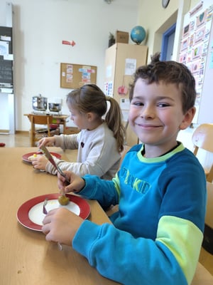 Der große Topf reichte gerade so, denn alle waren sich einig: "Unsere selbst angebauten Kartoffeln sind wirklich lecker!" Dass sie auch gesund sind und viele wertvolle Nährstoffe enthalten, das hatten wir in den Wochen davor besprochen und ein ganzes Kartoffelbuch gelesen, beschriftet und gestaltet. Mit dem gemeinsamen Essen beendeten wir das Kartoffelprojekt. Jetzt sind wir echte Kartoffel-Profis.