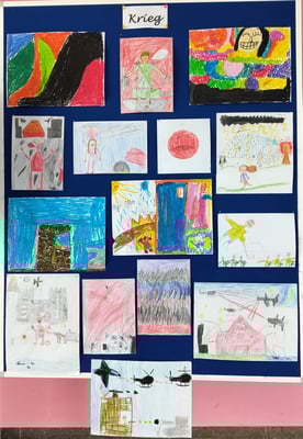 Was ist Frieden? Wie fühlt er sich? Wenn Frieden eine Person wäre, was hätte sie im Kleiderschrank? Wo würde sie sich wohl fühlen? In einem philosophischen Gespräch näherte sich die Klasse dem Thema Frieden an. Ihre Gedanken setzten die Kinder um in Bild und Wort. So entstand eine erste Ausstellungswand. Auch der Krieg verlangte nach künstlerischem Ausdruck. Der Gegenspieler des Friedens erhielt eine eigene Fläche.