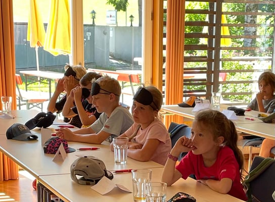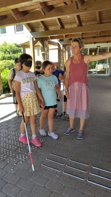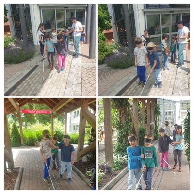 Wir sind mit verbundenen Augen und Blindenstöcken entlang den Führungslinien durchs Hotel und im Park gegangen. Manche Kinder durften auch mit dem Blindenhund gehen. Unser Highlight waren Fußball und Tischtennis für blinde Menschen: die Bälle sind mit Steinchen gefüllt und rasseln. Nicht nur die Kinder haben hier viel gelernt.