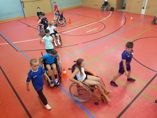 In einer ersten Fragerunde erfuhren wir viele interessante Dinge: dass Uli Autofahren kann, er gerne Basketball spielt und sogar immer noch Ski fährt, wie er es schafft, obwohl er seine Beine nicht bewegen und spüren kann, sich trotzdem selbst anzuziehen, in den Rollstuhl ein- oder auszusteigen und vieles mehr. Uli brachte auch viele Rollstühle mit, die wir gleich in der Turnhalle ausprobieren durften. Schon dabei konnten wir feststellen, wie viel Kraft das Rollstuhlfahren in den Armen benötigt.