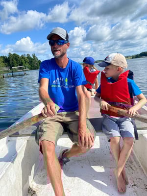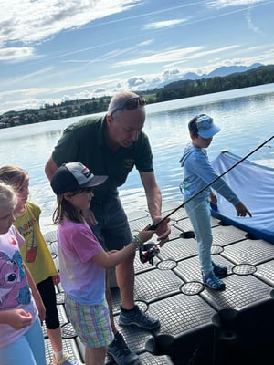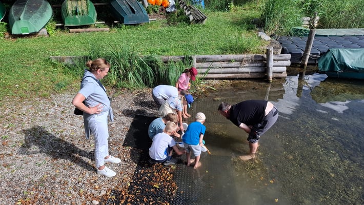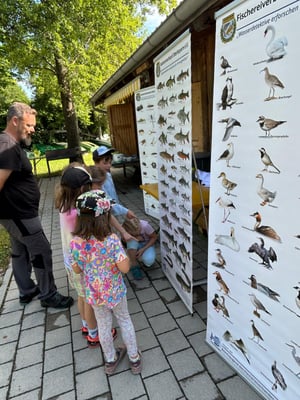 So machten sich am 27.6.25 auch die Schüler der Klasse 1b bei schönstem Wetter auf zum Riegsee. Dort erwarteten uns unterschiedliche Stationen. Herr Badstieber und seine Fischereimitglieder boten uns die Möglichkeit, das Angeln auszuprobieren. Wir durften mit einem Ruderboot auf den See fahren und mit Becherlupen kleine Tiere im See beobachten, z.B. Wasserflöhe und Seeschnecken – haben Sie davon schon mal gehört? Auch ein großartiges Stickerbuch mit vielen Informationen und Aufgaben rund um die Tierwelt der Seen bekamen wir und füllten es mit Hilfe. Gefangene Fische wurden genauestens betrachtet und untersucht. Den kleinen Babywels haben wir selbstverständlich danach wieder frei gelassen. Als Anschauungsmaterial zeigte man uns auch einen toten Hecht. Ganz schön scharf manche Fischzähne! Sogar ein Aal und ein Barsch wurden beim Rudern entdeckt. Ganz spannend fanden wir auch den Biberbau und seinen Bewohner, den wir vom Boot aus erreicht haben. Dort lag alles kreuz und quer. Wir kamen aus dem Staunen nicht mehr raus und hätten es noch viel länger am Riegsee ausgehalten. Vielen Dank an Herrn Badstieber und sein Team, dass sie uns diesen tollen Tag und all die spannenden Momenten ermöglicht haben.
