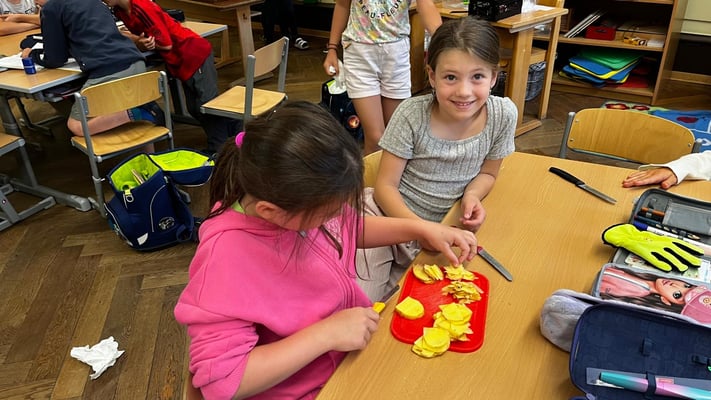 Am Freitag schnitten die Kinder die Kartoffeln sehr fein und buken im Ofen Kartoffelchips, die sehr gut schmeckten und unverpackt waren und sammelten schließlich auf einer Runde um die Schule mehrere Säcke voll Müll. Es hat allen Spaß gemacht und war eine kleine Anregung, das eigene Konsumverhalten zu überdenken.