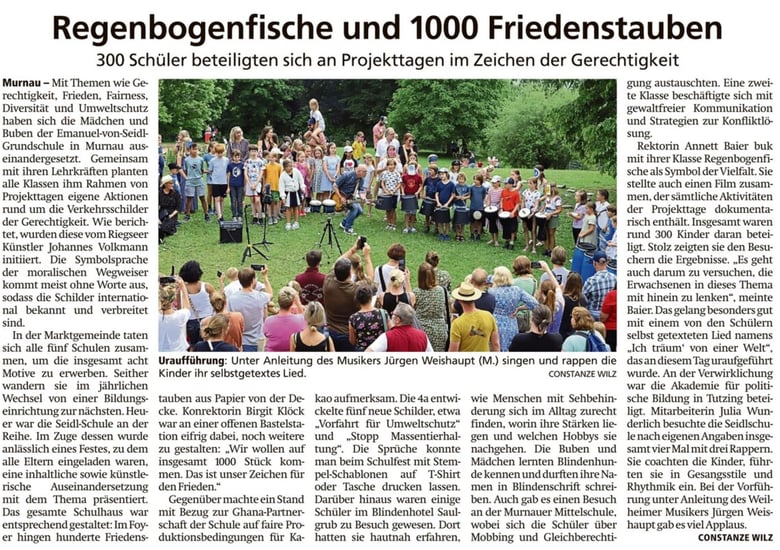 Auch bei diesem Projekt wurde die Seidelschule von vielen externen Partnern unterstützt. So öffnete die Konditorei Krönner wieder ihre Türen, um den Kindern das Thema Fairness am Beispiel der Schokoladenproduktion zu verdeutlichen. Mit Unterstützung der Akademie für politische Bildung in Tutzing rappten einige Klassen mit dem bayerischen Meister im Poetry Slam. Herr Korschefsky Leiter der biologischen Station im Murnauer Moos vermittelte den Kindern, welch großer Schatz an biologischer Vielfalt vor Murnaus Toren liegt und wie viele große und winzig kleinen Phänomene es dort zu entdecken und beobachten gibt. Besonders beeindruckt zeigten sich auch die Erstklässler, als sie im Aura-Hotel, das sich auf die Erholung sehbeeinträchtigter Menschen spezialisiert hat, für eine kurze Zeit in eine Welt ohne sehen zu können, eintauchen konnten. Herzlichen Dank an alle, die uns bei diesem Projekt unterstützt haben!